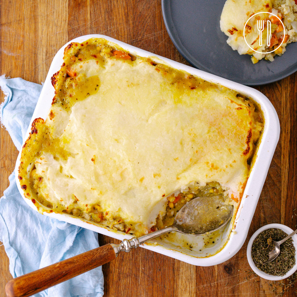 A comforting cottage pie featuring a chicken and vegetable filling topped with smooth mashed potatoes, grilled to golden perfection.