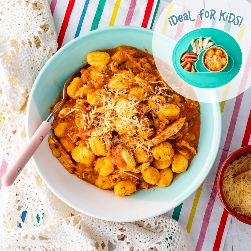 Fluffy potato gnocchi tossed in an Italian-style fresh tomato sauce with chicken and parmesan cheese.