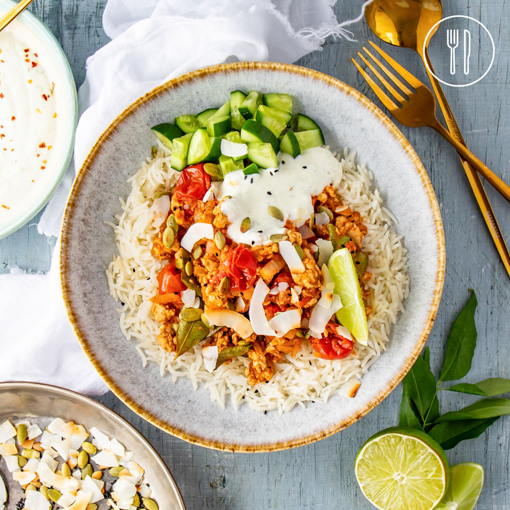 Indian chicken mince curry spiced with fresh curry leaves and bush curry spice mix from WA locals, GH Produce. Served over fluffy basmati rice and finished with lime yoghurt and a nigella seed topping.