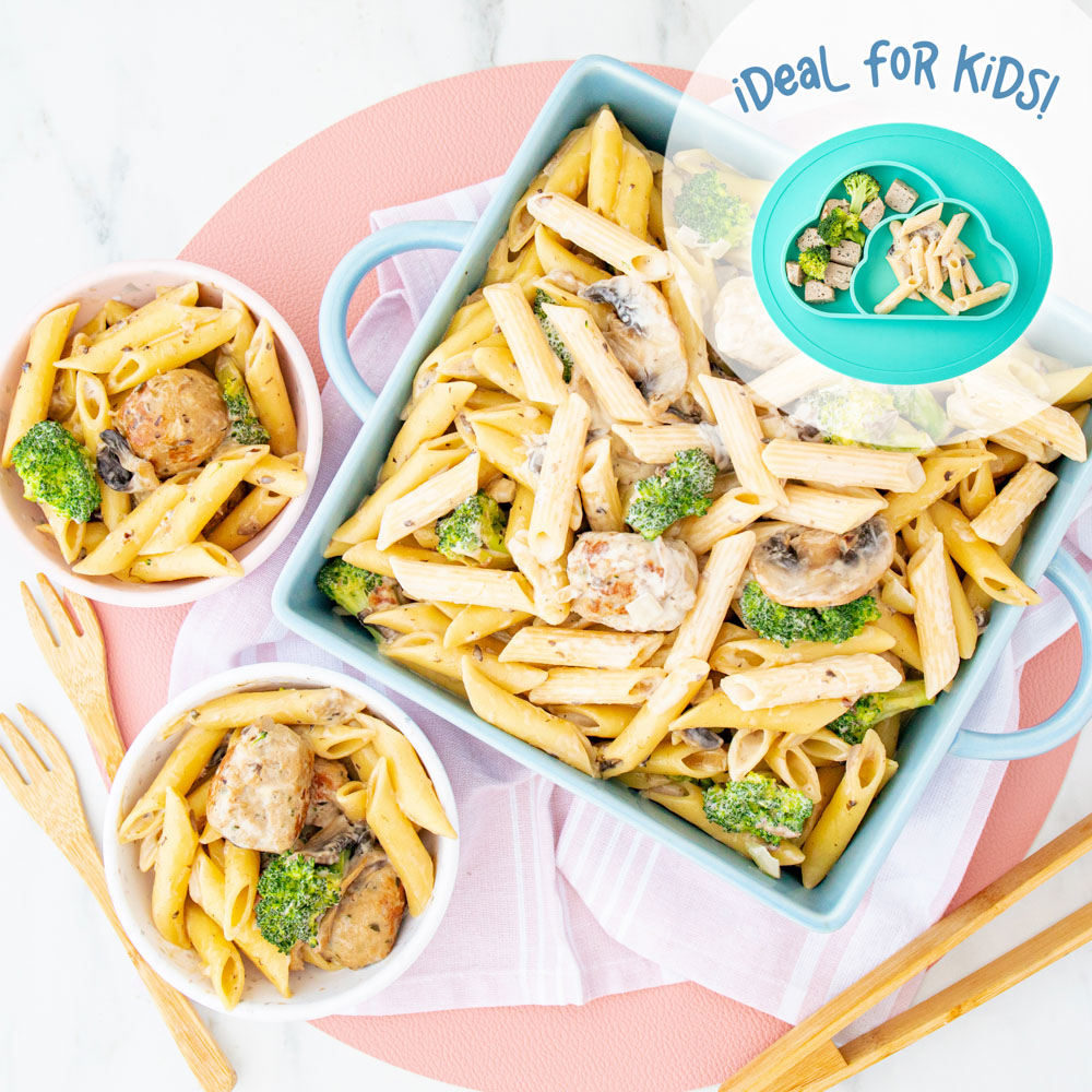 Golden chicken meatballs and broccoli tossed with penne pasta in a deliciously creamy sauce.