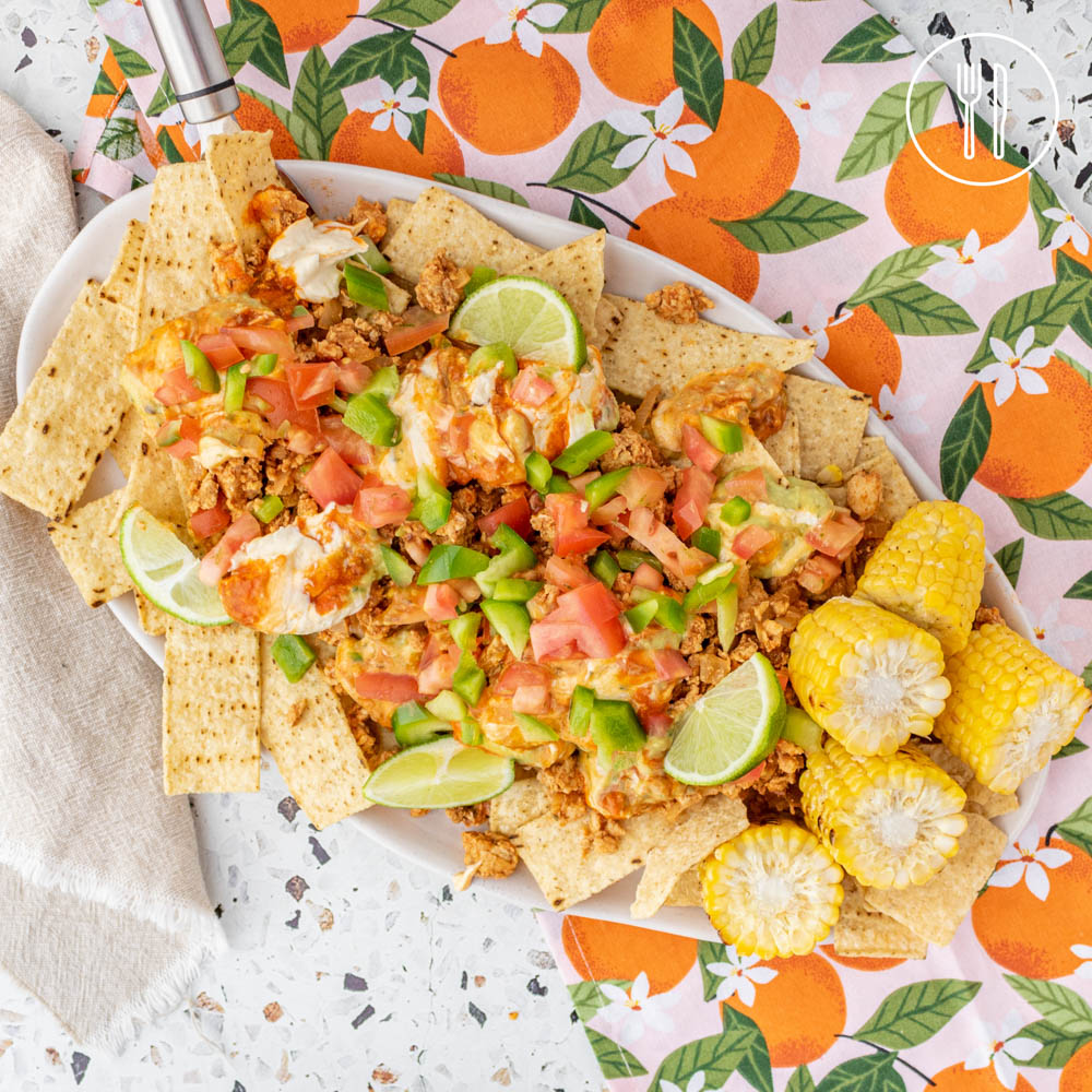 Crispy corn tortilla strips topped with Mexican chicken, fresh salsa and Heavenly Nachos dip; served with corn cobettes and lime.