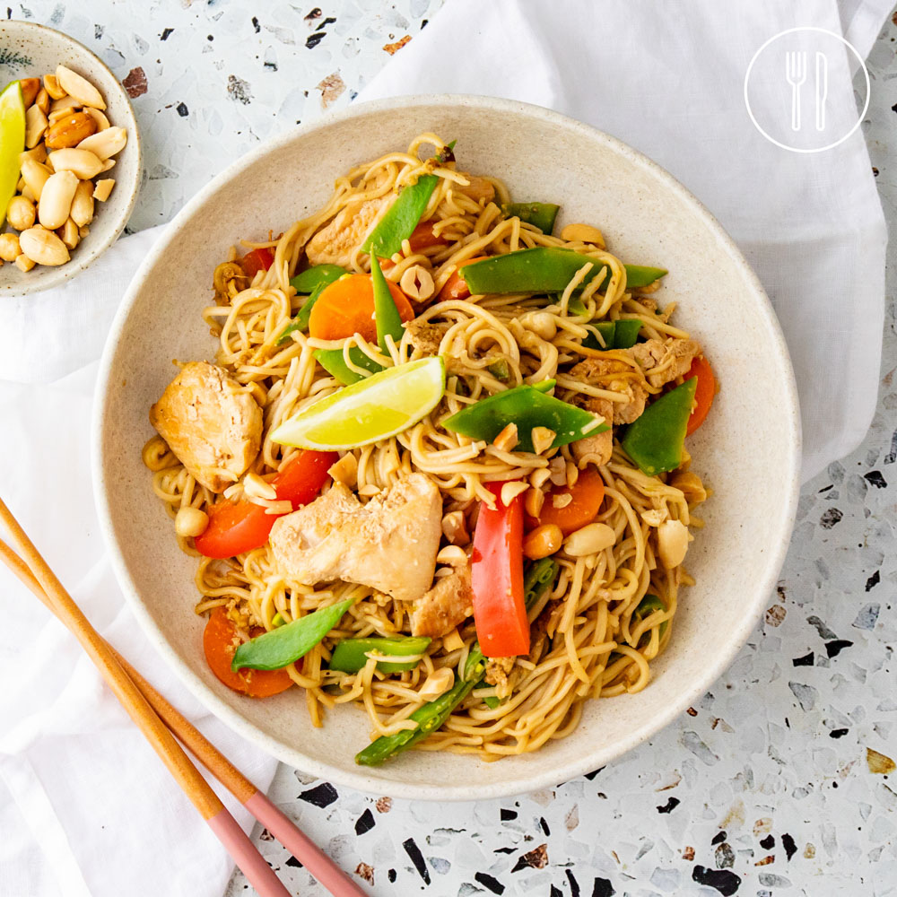 chicken stir-fry strips, egg noodles, roasted peanuts, hoisin sauce, snow peas, red capsicum, carrot, ginger, lime, garlic clove