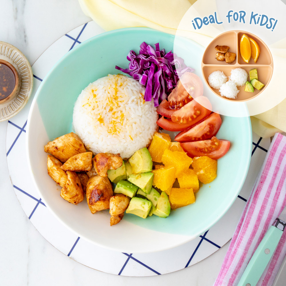 This family-friendly, vibrant take on the classic Hawaiian Poké bowl features golden chicken nuggets and fresh salad ingredients served over jasmine rice, all drizzled with a zesty orange and soy dressing.