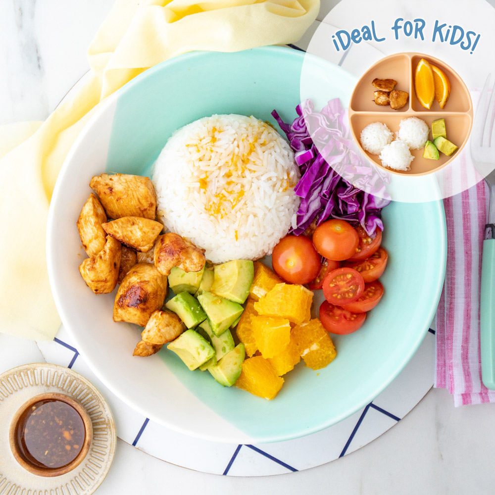 This family-friendly, vibrant take on the classic Hawaiian Poké bowl features golden chicken nuggets and fresh salad ingredients served over jasmine rice, all drizzled with a zesty orange and soy dressing.
