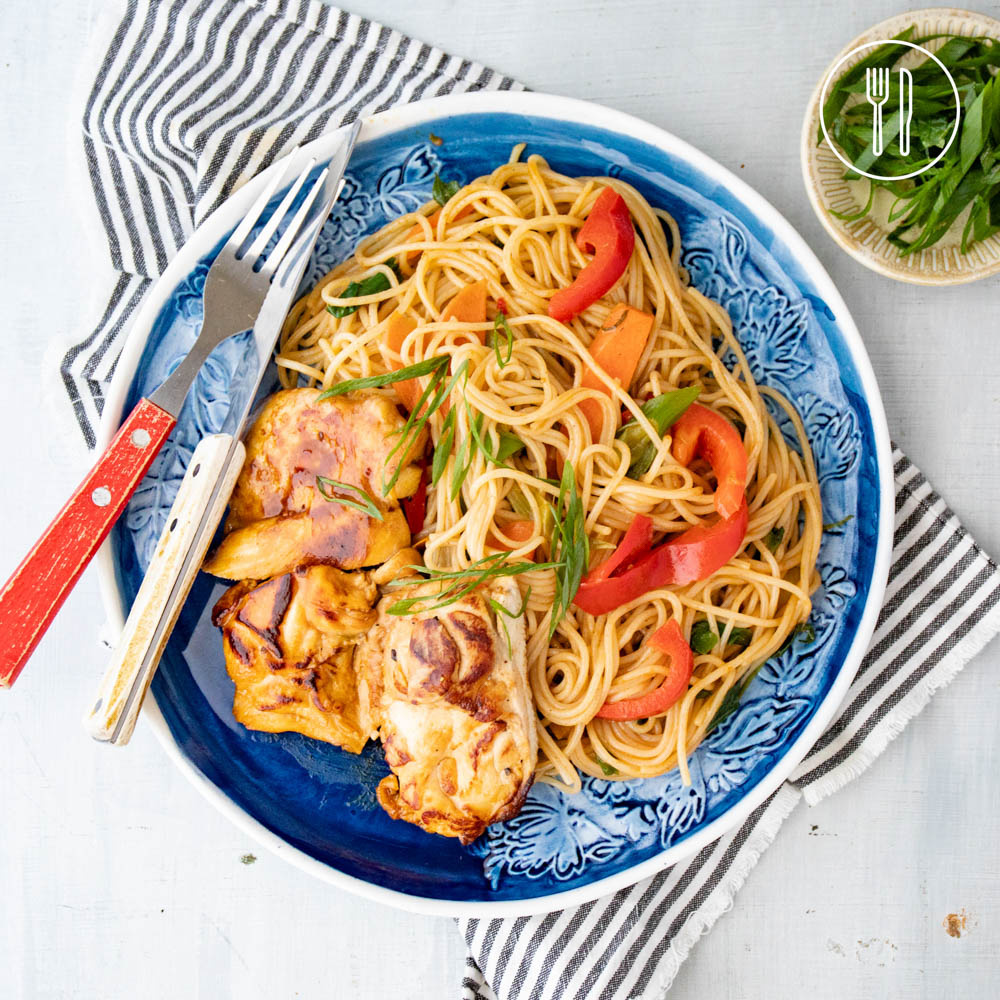Rice vermicelli noodles tossed with stir-fry vegetables and served with tender chicken thigh fillets.
