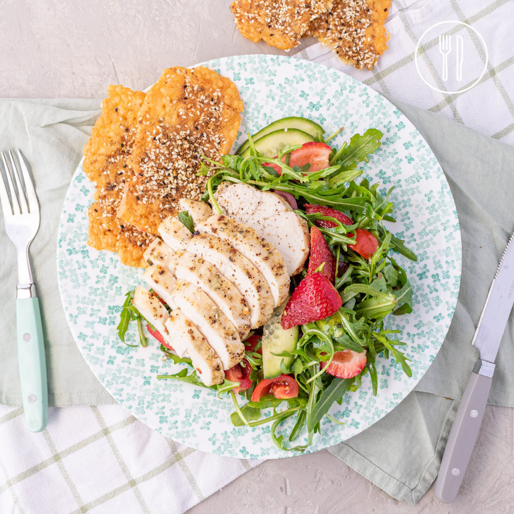 chicken breast fillet, dukkah, parmesan cheese, rocket leaves, cherry tomatoes, Lebanese cucumber, strawberries
