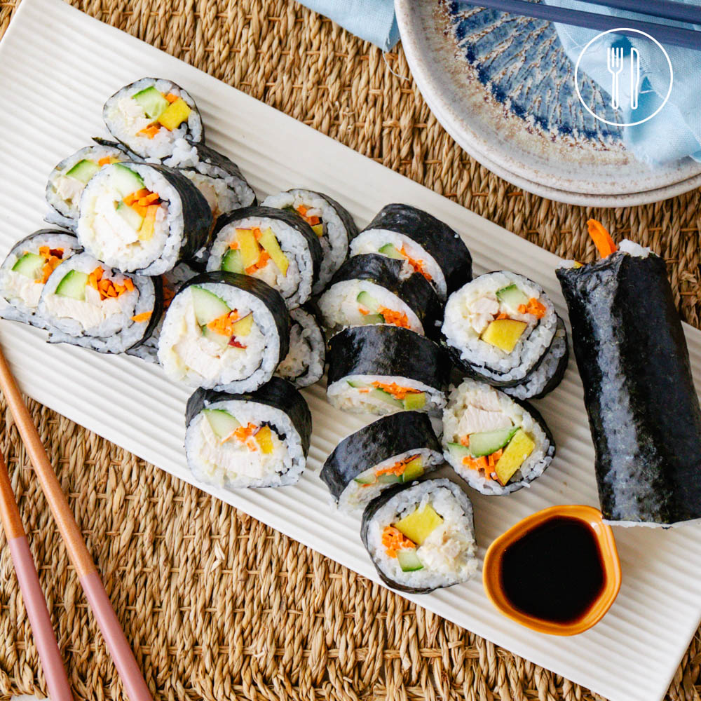 Easy to make sushi rolls with precooked chicken breast, cucumber, carrot and sweet mango.
