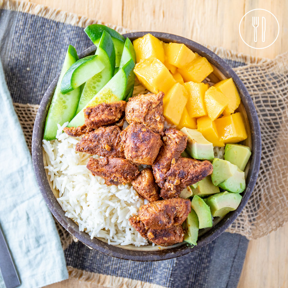 An Indian inspired bowl of sunshine! Diced chicken breast cooked with our home made tikka spice blend, served in a bowl with coconut rice, fresh mango, cucumber and avocado.