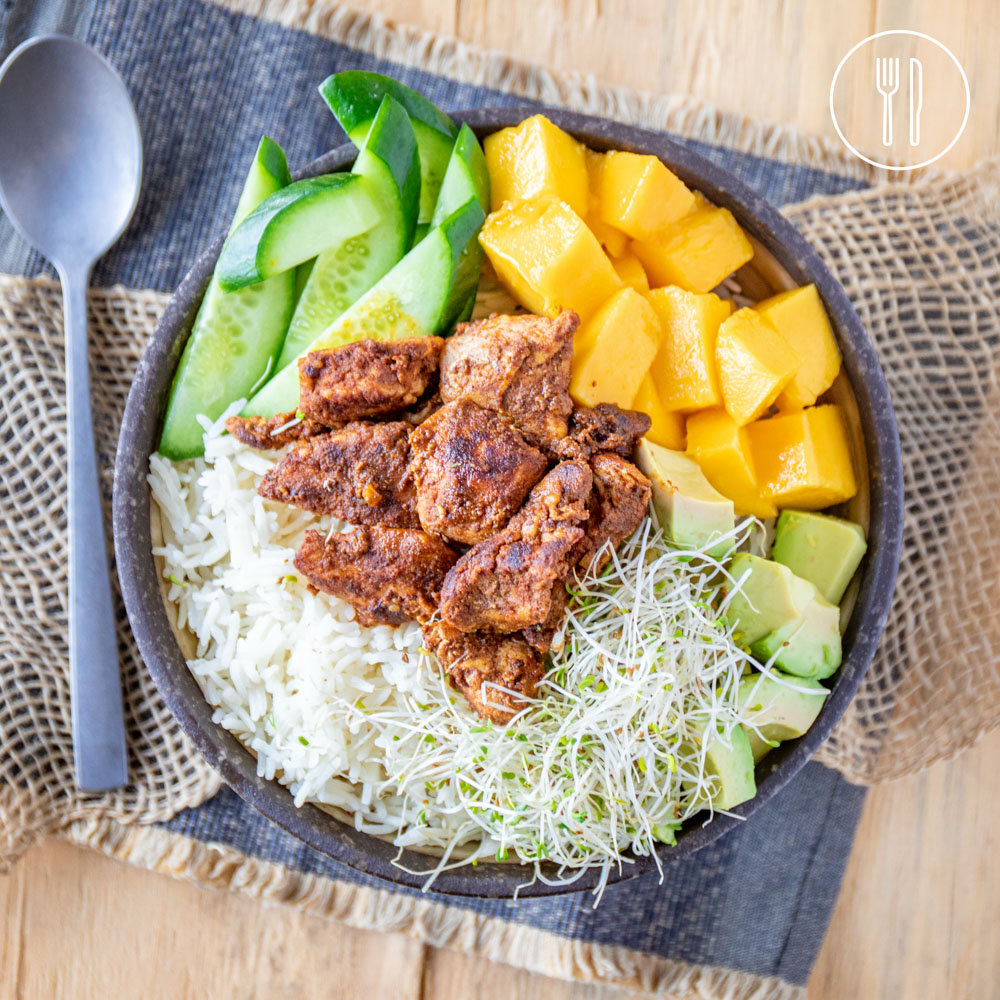 An Indian inspired bowl of sunshine! Diced chicken breast cooked with our home made tikka spice blend, served in a bowl with coconut rice, fresh mango, cucumber and avocado.