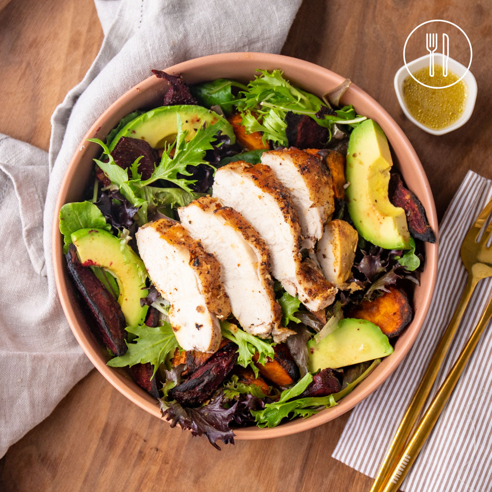 Roast chicken breast fillet with a vibrant salad of beetroot, carrot, avocado and mesclun leaves.
