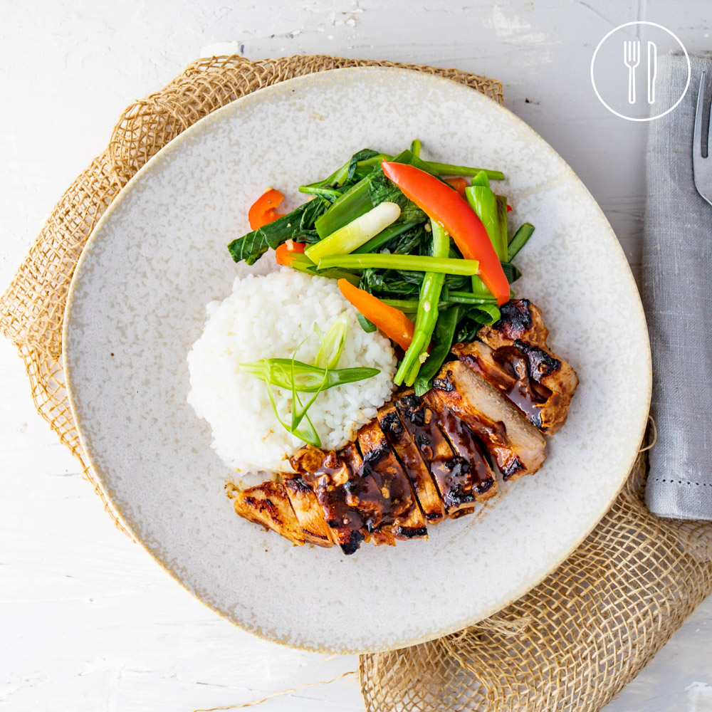 A home made version of the much loved char siu BBQ pork-sweet and savoury! Served on a bed of sticky rice with a side of garlic stir-fry vegetables.