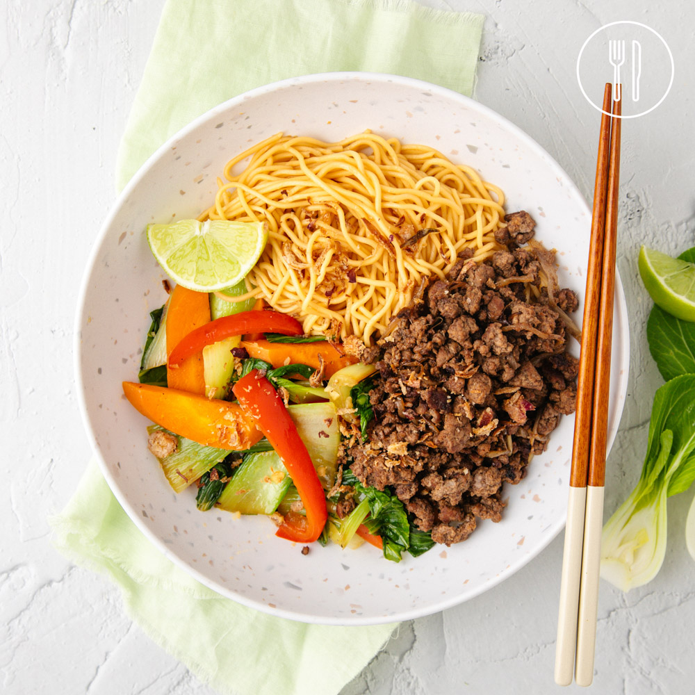 beef mince, fried shallots, egg noodles, Asian greens, red capsicum, carrot, ginger, lime, shallot, garlic clove