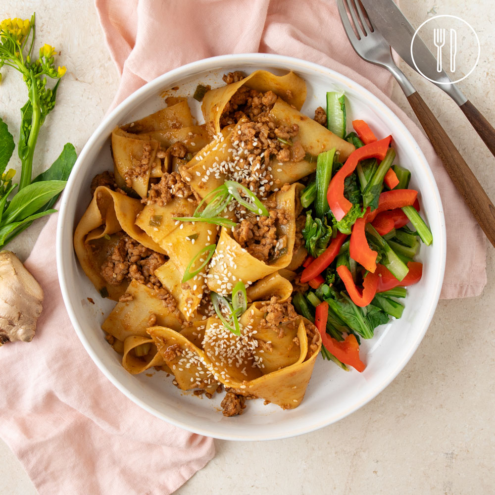 A fun twist on hand pulled noodles using fresh lasagne sheets as to create rustic-style noodles, tossed with pork mince cooked with a flavour packed Chinese stir-fry sauce. Topped with sesame seeds and fresh spring onions.