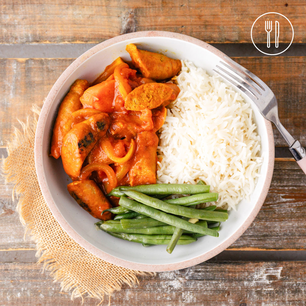 Fragrant basmati rice and tender green beans served alongside juicy beef chipolatas in a hearty tomato-based curry sauce with carrots and a hint of warm spice.