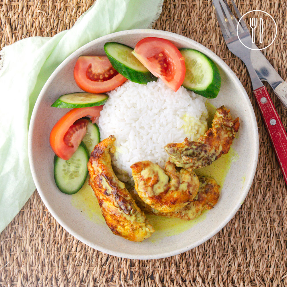 Creamy coconut and turmeric chicken on a bed of rice with a side of fresh cucumber and tomato.