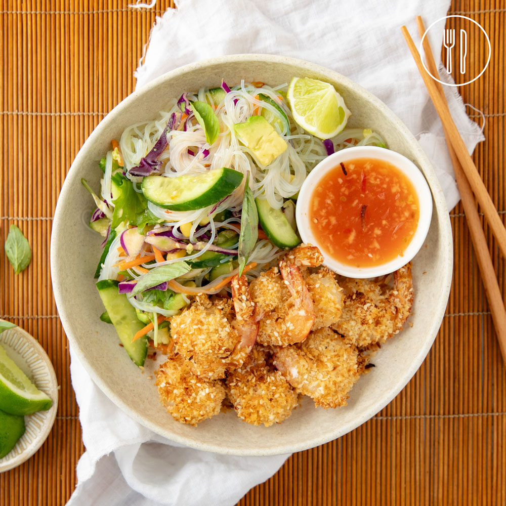 Oven-baked crispy coconut prawns, paired with a refreshing Thai-style noodle salad and a sweet-sour pineapple dressing for a vibrant and tropical dinner.