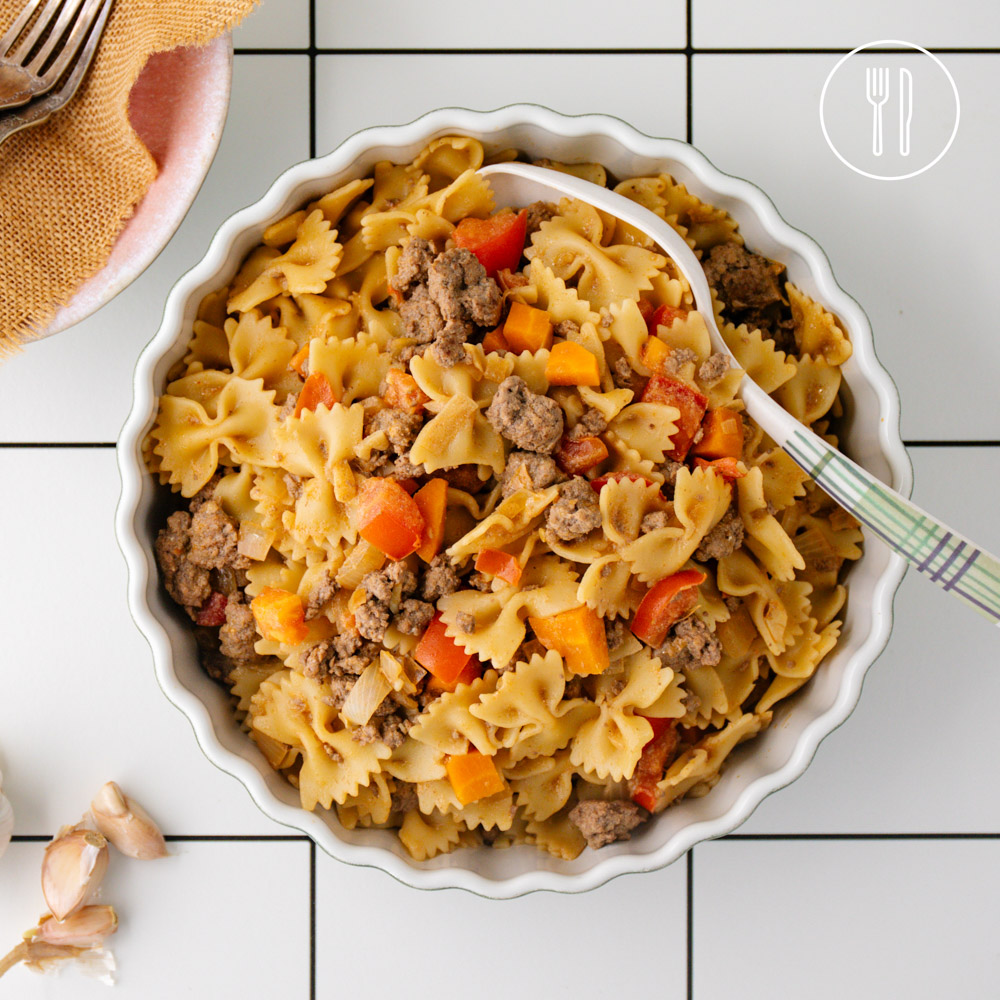 A hearty, family-friendly pasta dish with a rich and creamy tomato-based beef sauce, tossed with tender bowtie pasta for a comforting meal.
