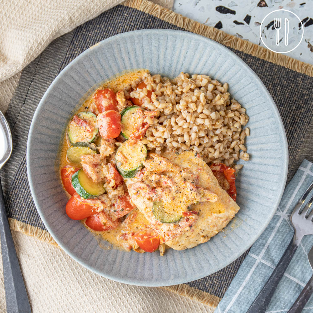 Chicken breast pieces, courgettes and cherry tomatoes cooked in a delicious creamy balsamic, sun-dried tomato and oregano sauce. Served over nutty pearl barley.