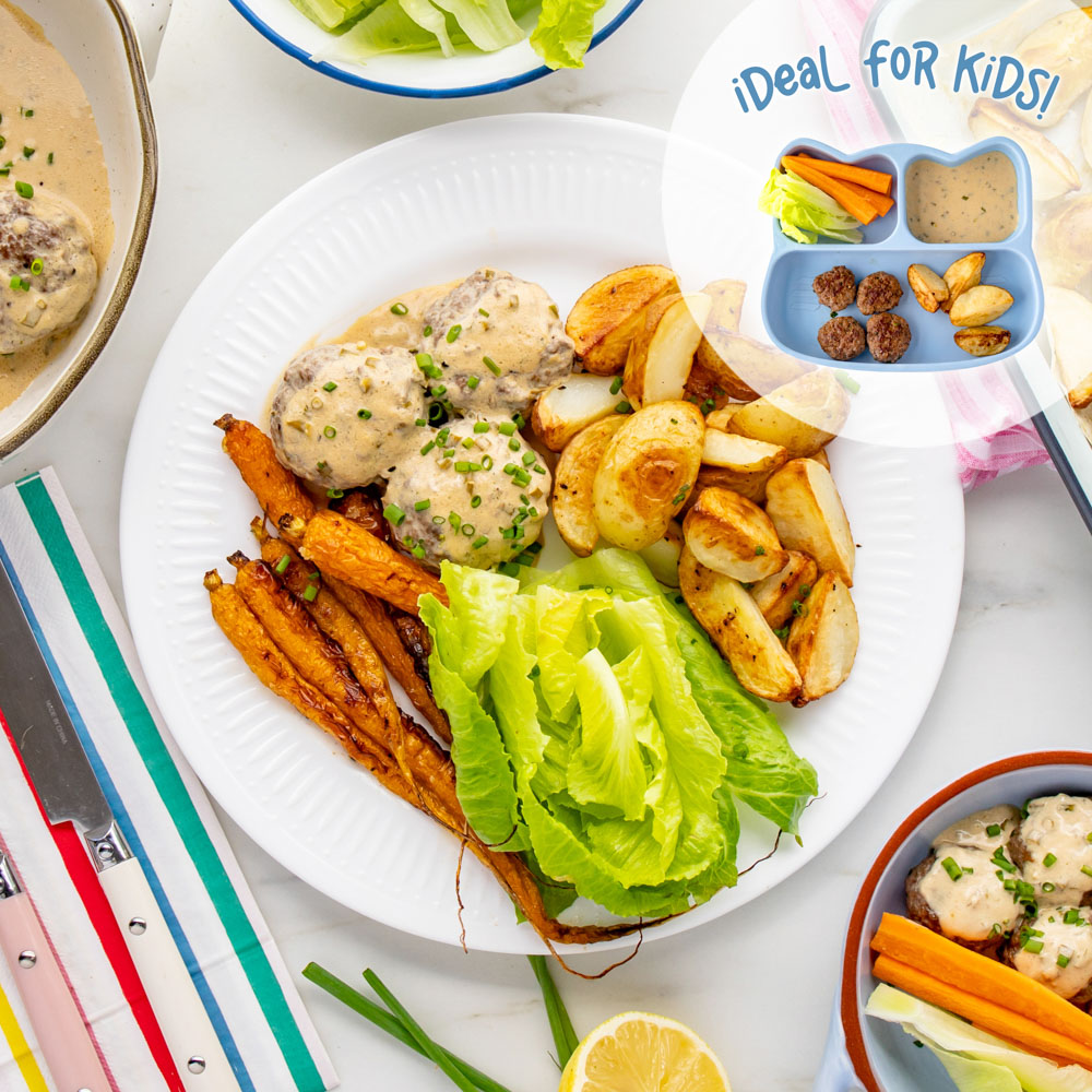 Beef rissoles served in a creamy chive & lemon gravy alongside roasted wedges and baby carrots.