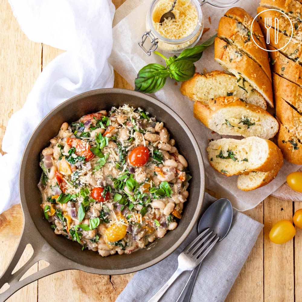 This delicious one-pan meal features white beans, burst cherry tomatoes and spinach, cooked in a homemade cashew cream sauce and served with garlicky sourdough rolls and fresh basil. Comforting and packed with both protein and fibre!