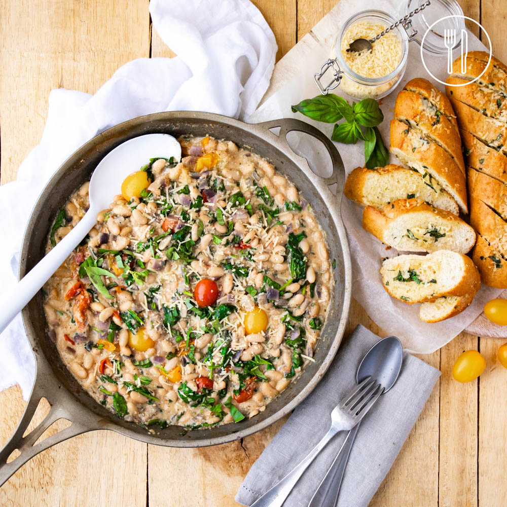 This delicious one-pan meal features white beans, burst cherry tomatoes and spinach, cooked in a homemade cashew cream sauce and served with garlicky sourdough rolls and fresh basil. Comforting and packed with both protein and fibre!