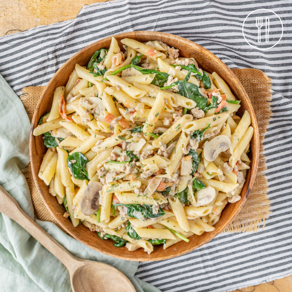 short pasta, cream cheese, pork mince, baby spinach, sliced mushrooms, brown onion, tomato