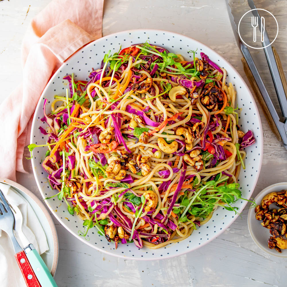 A fresh and vibrant noodle salad using Mrs Tran’s thick rice vermicelli and a creamy cashew satay sauce, all tossed with fresh mint, cabbage and sprouts, finished with sweet and salty peanut cluster pieces.