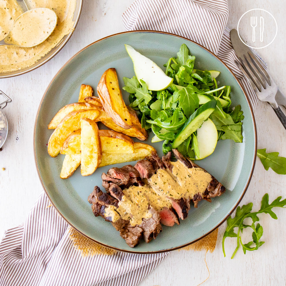 Juicy beef steaks served with golden wedges and a creamy peppercorn, garlic and tarragon sauce alongside a simple rocket and pear salad.