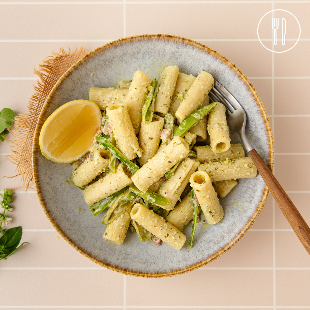 Creamy rigatoni pasta is tossed in a rich homemade basil and almond pesto sauce with crispy bacon, tender broccoli and snow peas, finished with zesty lemon.