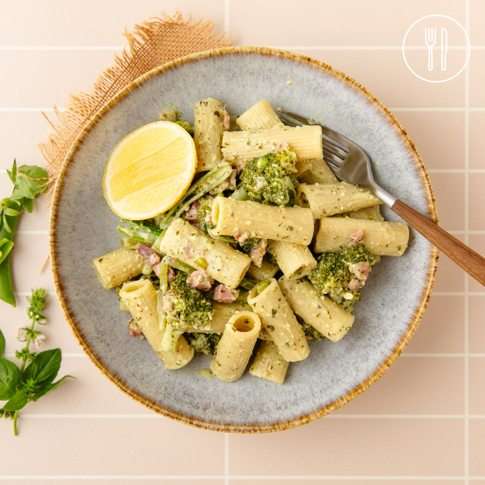 Creamy rigatoni pasta is tossed in a rich homemade basil and almond pesto sauce with crispy bacon, tender broccoli and snow peas, finished with zesty lemon.