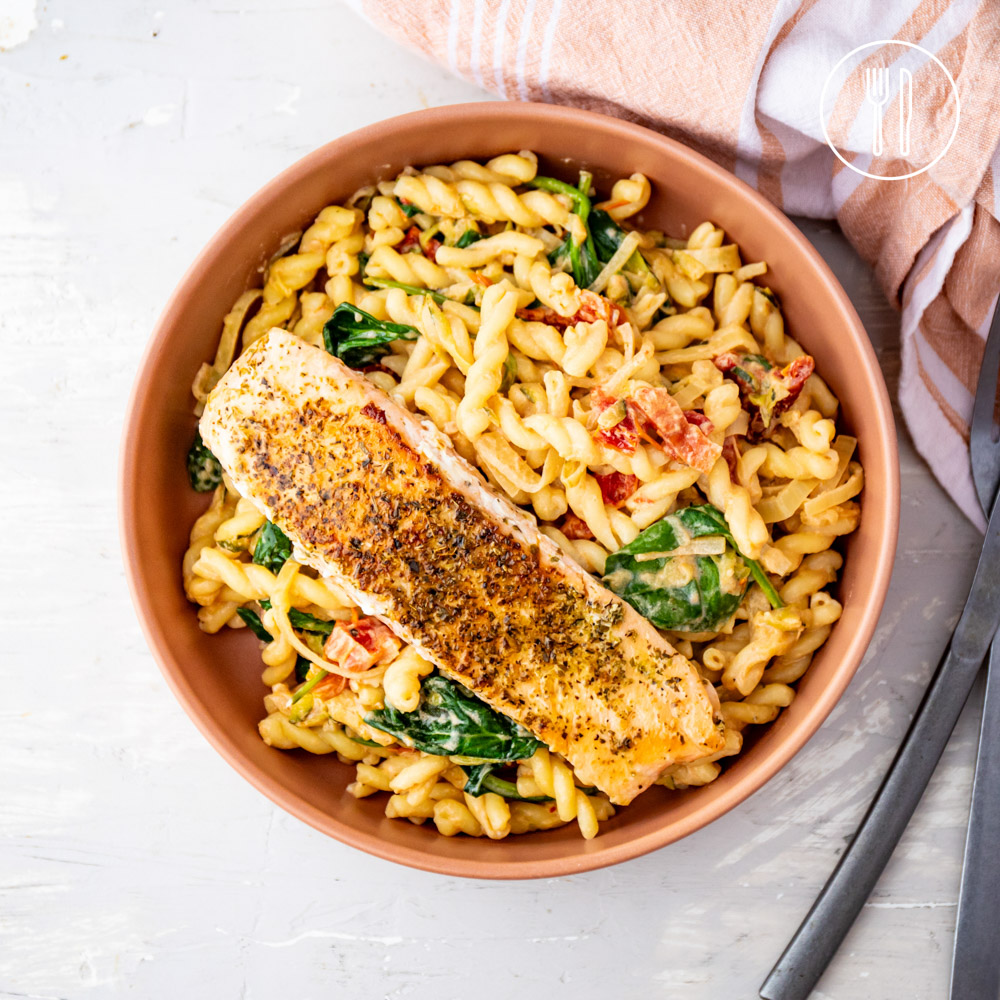 Salmon fillets pan-fried and served with a beautifully creamy tuscan pasta of sun-dried tomatoes, grated zucchini and baby spinach.