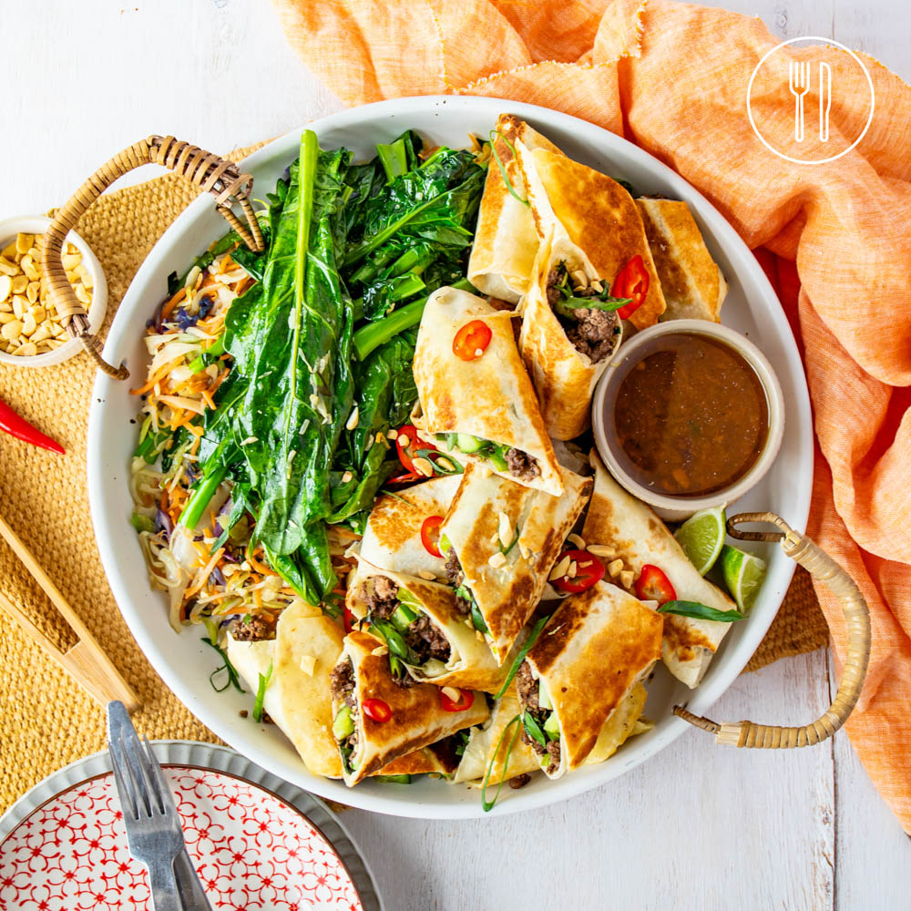 beef mince, roasted peanuts, wheat wraps, Thai basil, coleslaw, Asian greens, red chilli, Lebanese cucumber, ginger, lime, spring onions, garlic clove