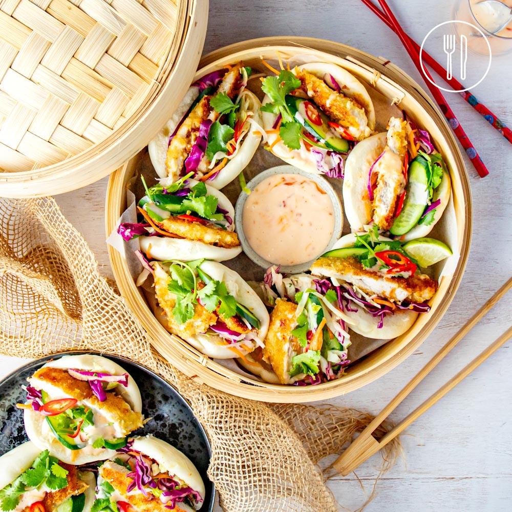 Soft and fluffy bao buns from Mrs Trans filled with golden panko crusted chicken, lime dressed slaw and a creamy sweet chilli aioli. A definite crowd pleaser!