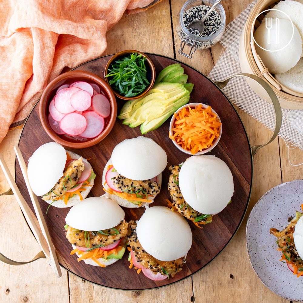 Fluffy bao buns filled with crispy sesame chicken, tossed in a mild Korean sauce, with pickled radishes and fresh fillings!
