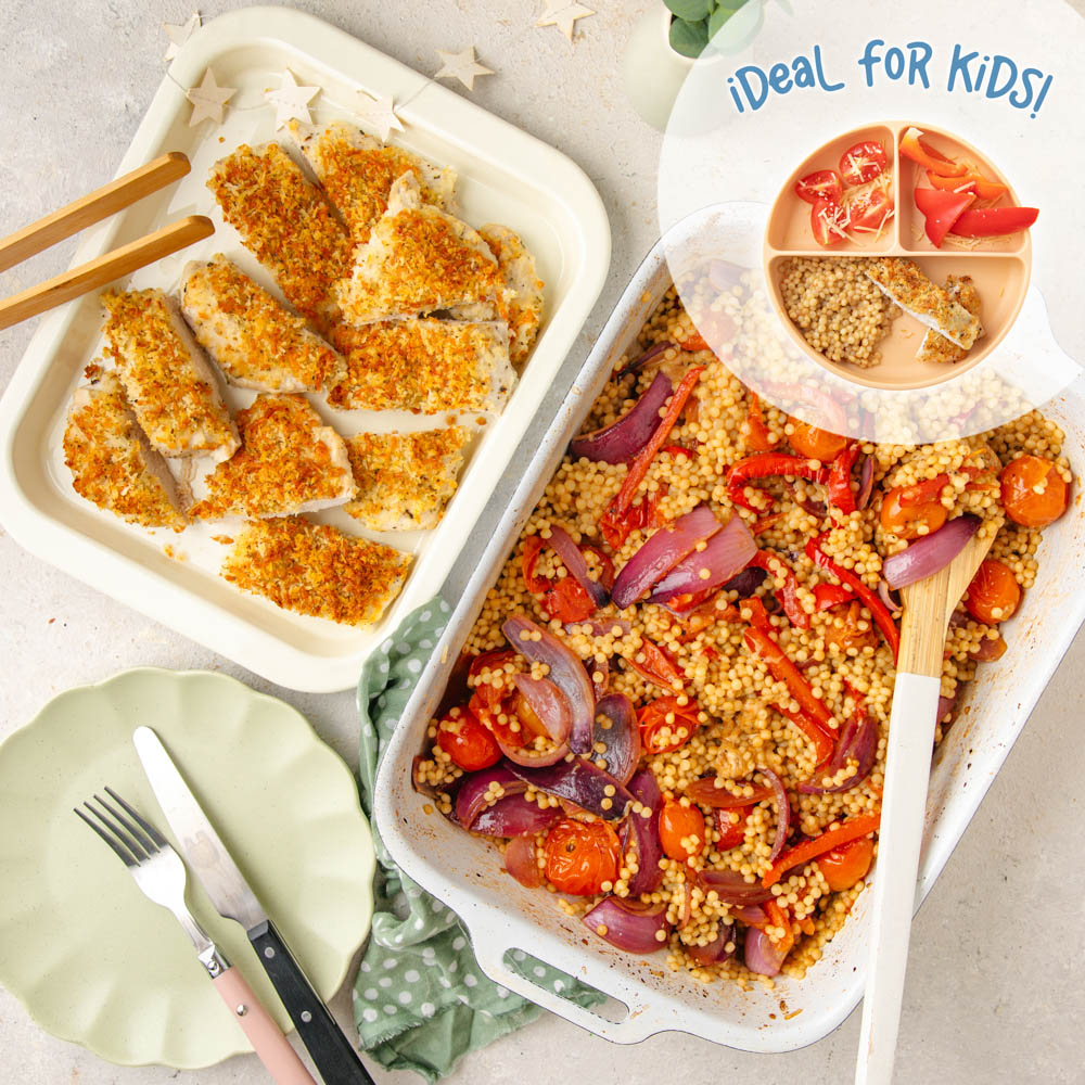 Oven baked parmesan oregano chicken schnitzels served with sweet tomato pearl couscous.