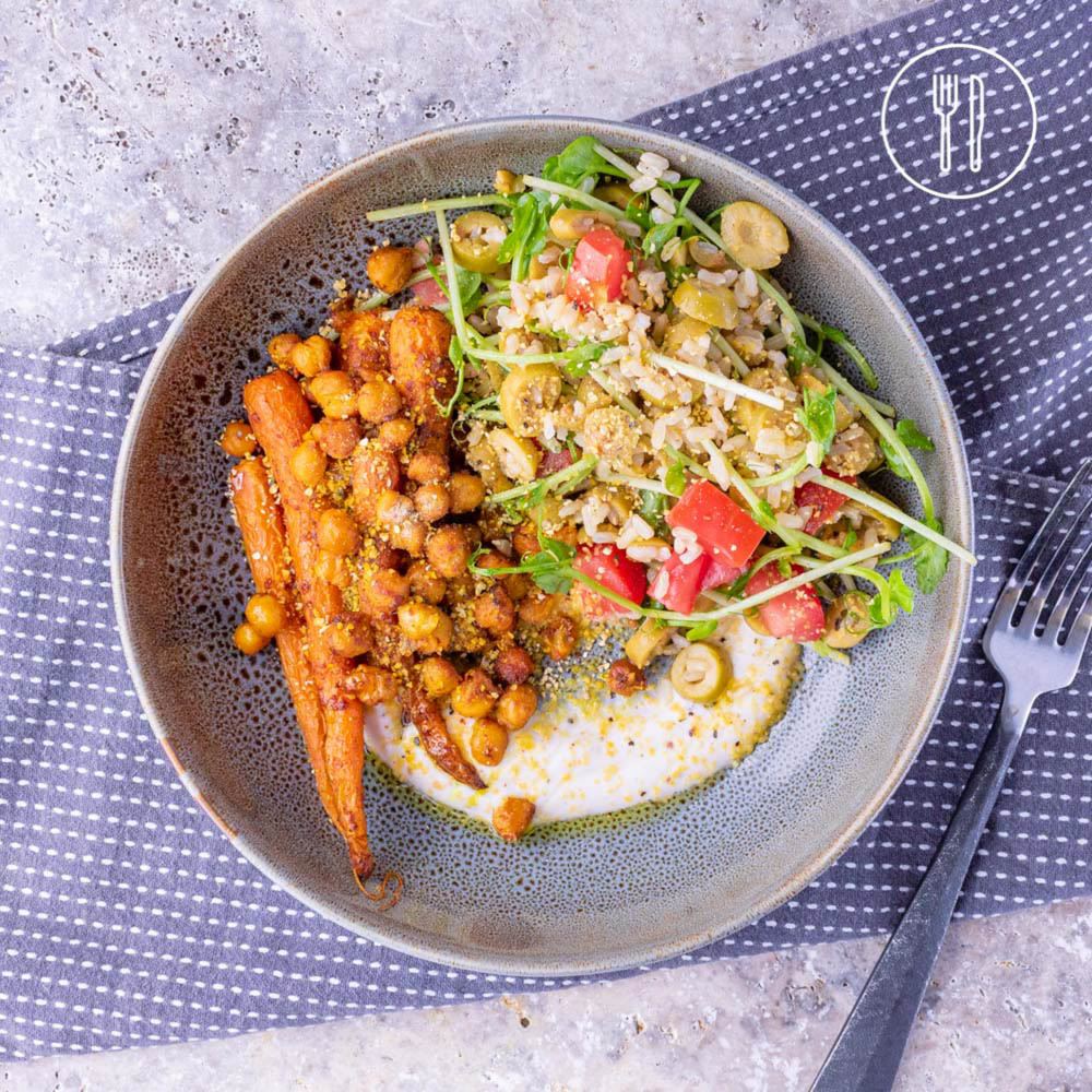 Crispy roasted chickpeas and Dutch carrots served on a rice salad with lemon lupin crumbs and a coconut yoghurt sauce.