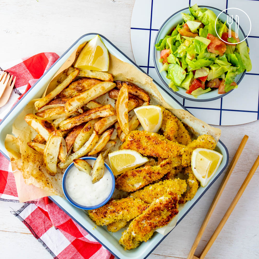 Herb and garlic crumbed chicken fingers with golden chips, chopped salad and tartare sauce for dipping.