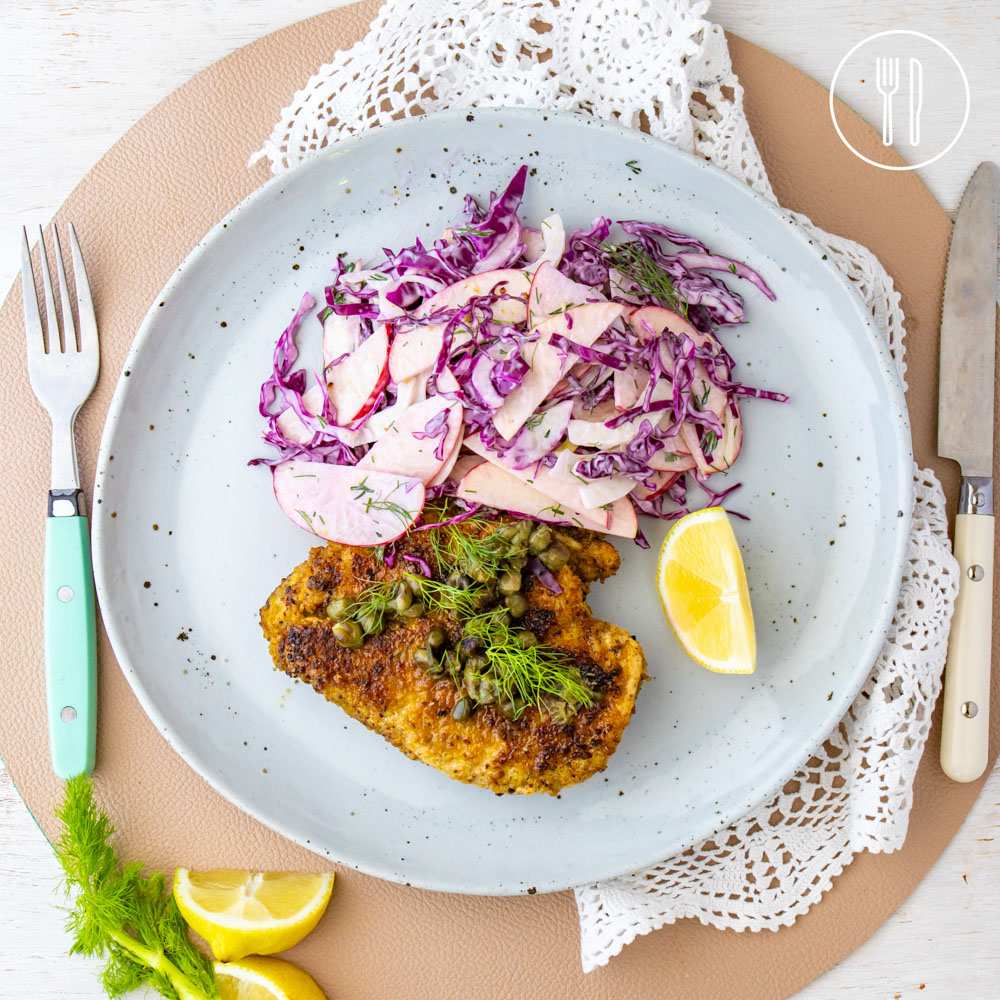 Lupin crumbed pork steaks drizzled with crispy caper butter and served alongside a cooling apple, fennel and red cabbage slaw.