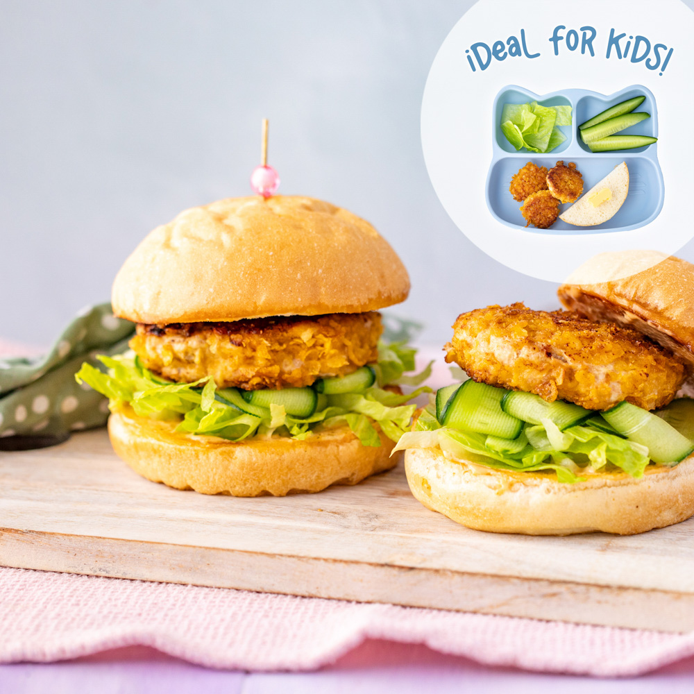 Large crunchy cornflake chicken patties served in fresh burger buns with shredded baby cos, cucumber ribbons and a classic burger sauce.