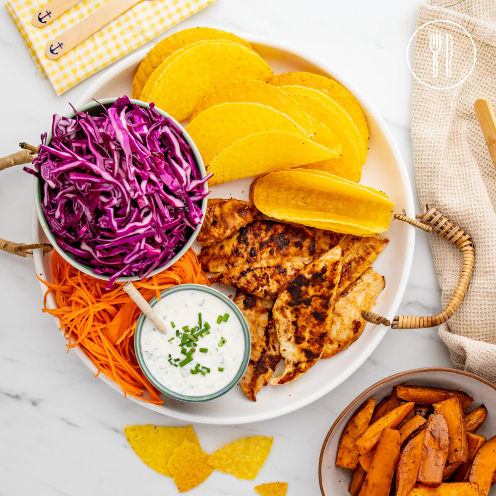 Pan-fried white fish fillets served on the perfect platter with fresh vegetables, chive yoghurt sauce, crunchy taco shells and a side of roasted sweet potato wedges!