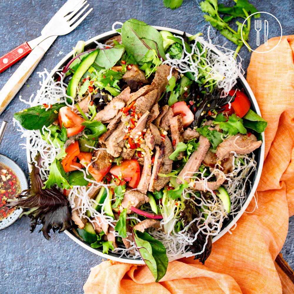A fresh Thai inspired salad featuring a punchy coriander, lime and chilli dressing spooned over seared steak and a bed of crispy puffed bean thread noodles.