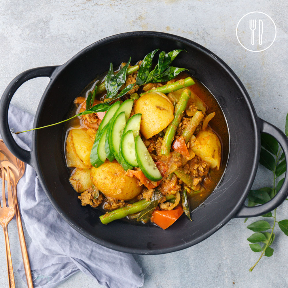 A hearty and aromatic Lamb Durban curry made with spiced lamb mince, baby potatoes, green beans, and a rich tomato-based sauce infused with curry leaves and a fragrant custom blend of warming spices.