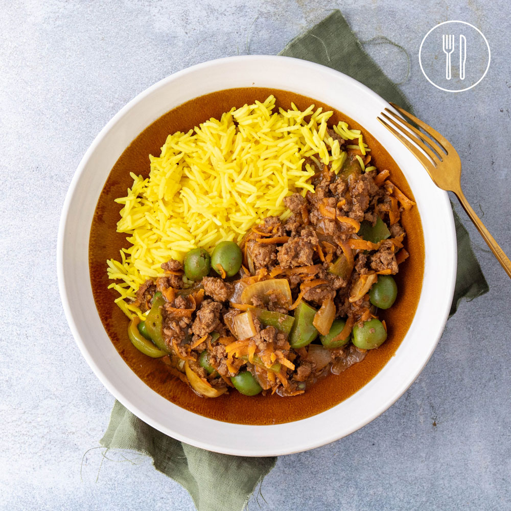 An aromatic Cuban inspired beef stew infused with warm spices, capsicum, and carrot. Served alongside fluffy rice.