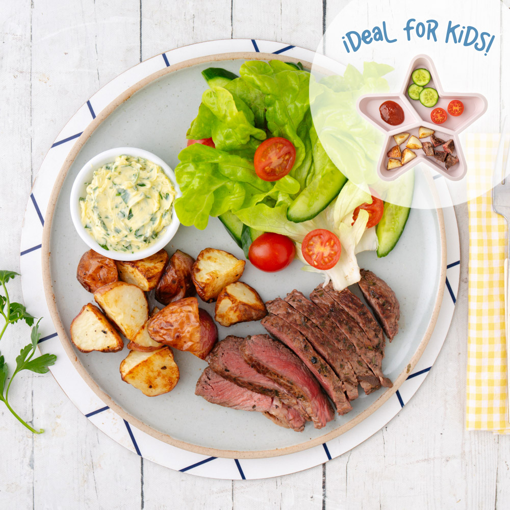 Grilled beef steaks served with golden crispy potato, fresh salad and a dollop of garlic and parsley butter.