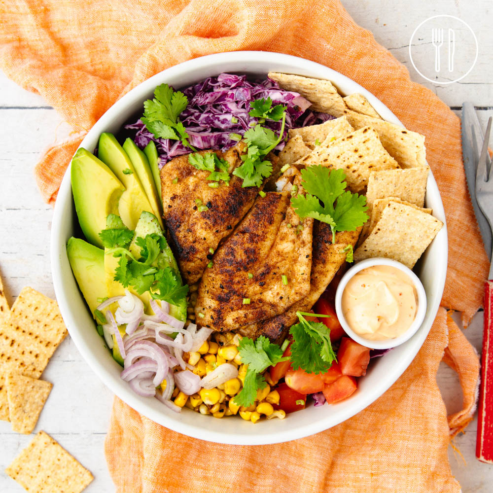 A fresh, Tex-Mex inspired bowl layered with chipotle & lime dressed cabbage, charred corn, pan-fried fish and crunchy tortilla strips. Perfect for warm evenings when you want big flavour without much fuss.