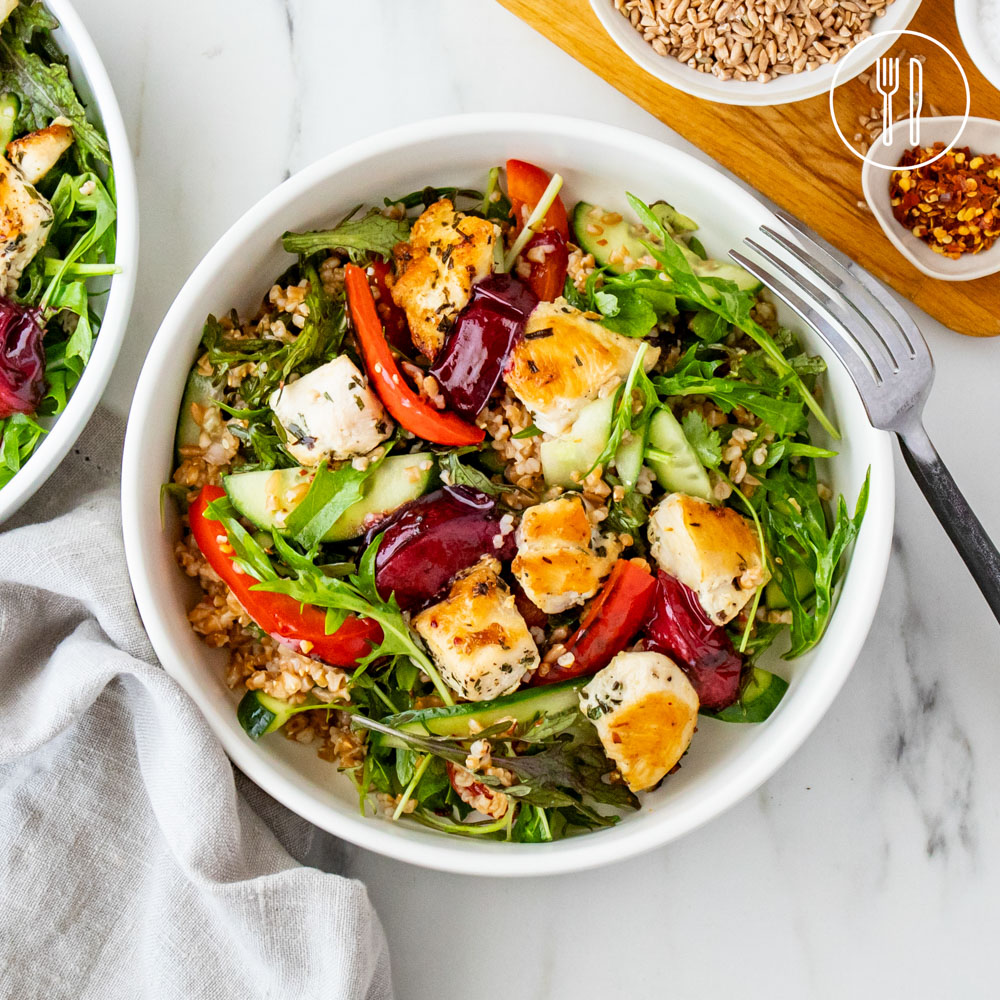 diced chicken breast, honey shot, freekeh, rocket leaves, Lebanese cucumber, plum