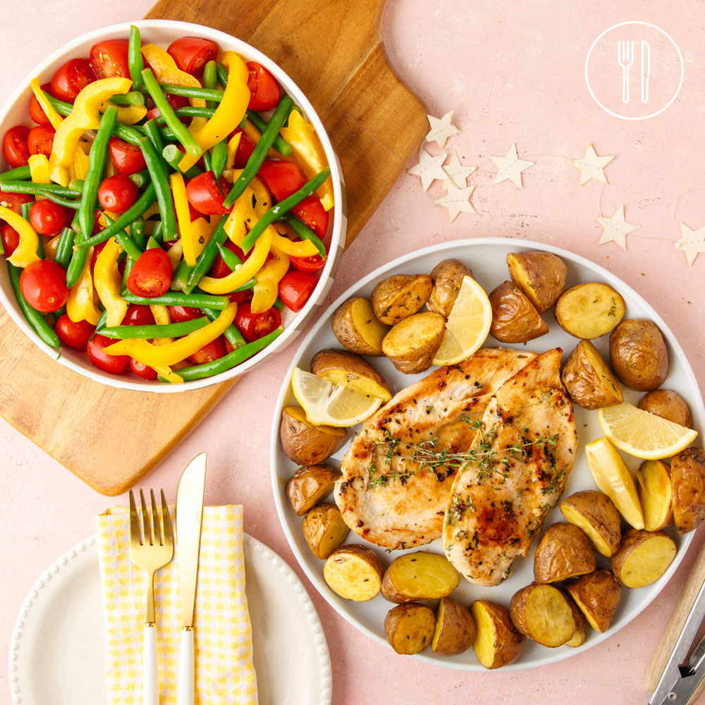 Juicy chicken schnitzels pan-fried with garlic butter, served alongside golden thyme roasted potatoes and a colourful bean salad.