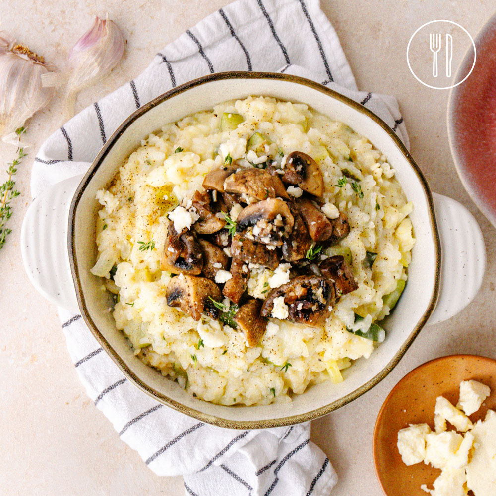 A creamy risotto infused with thyme, topped with golden mushrooms and crumbled feta for a rich, savoury finish.