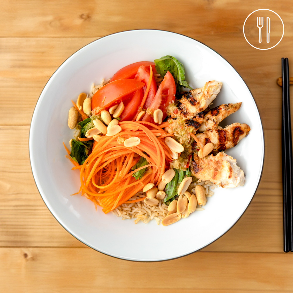 Chicken tenderloins coated in a ginger lime dressing and grilled, served in a brown rice bowl with fresh, crunchy vegetables and roasted peanuts.