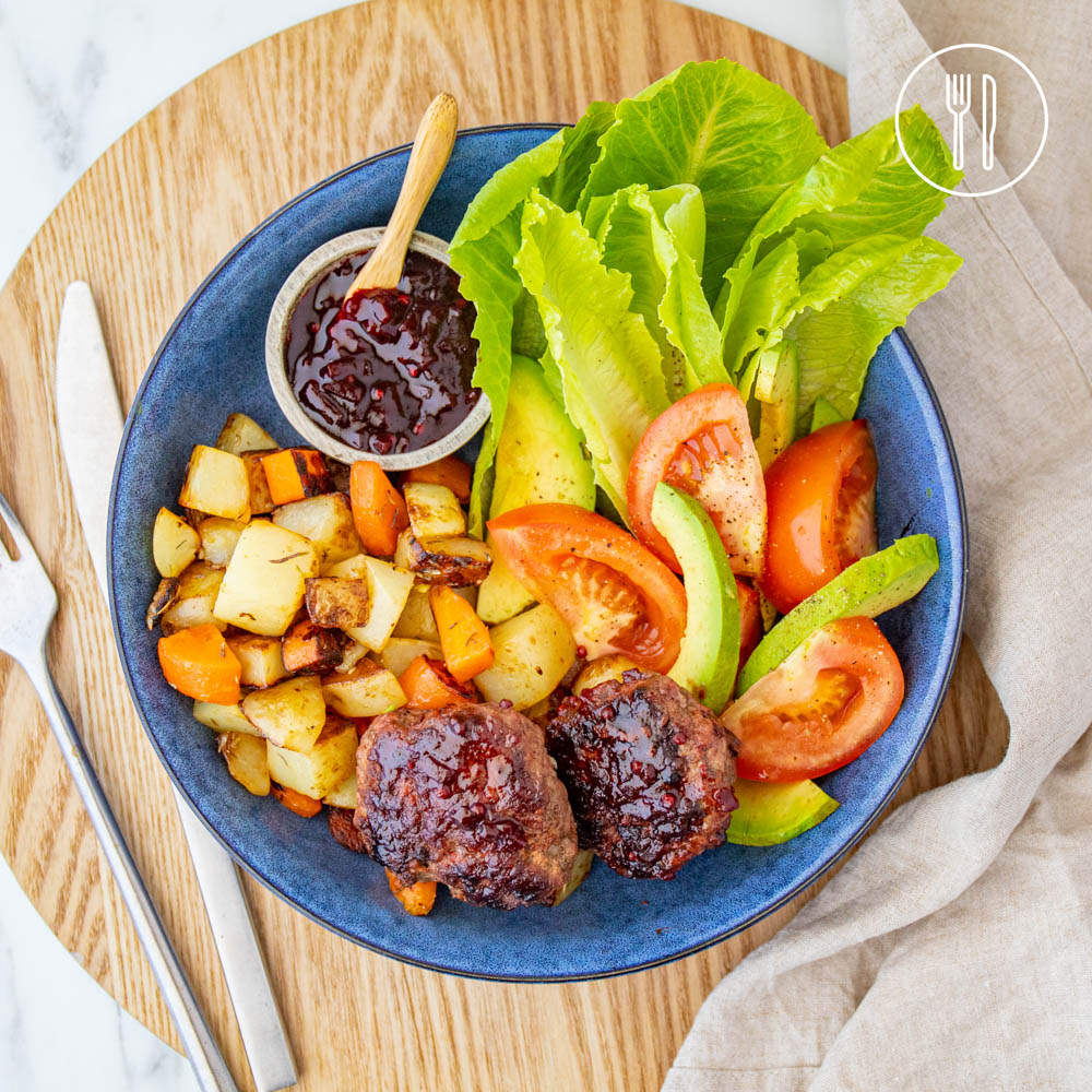 Golden cubes of potato and carrot cooked in the pan until crisp and served alongside glazed beef rissoles, fresh garden salad and balsamic beetroot relish.